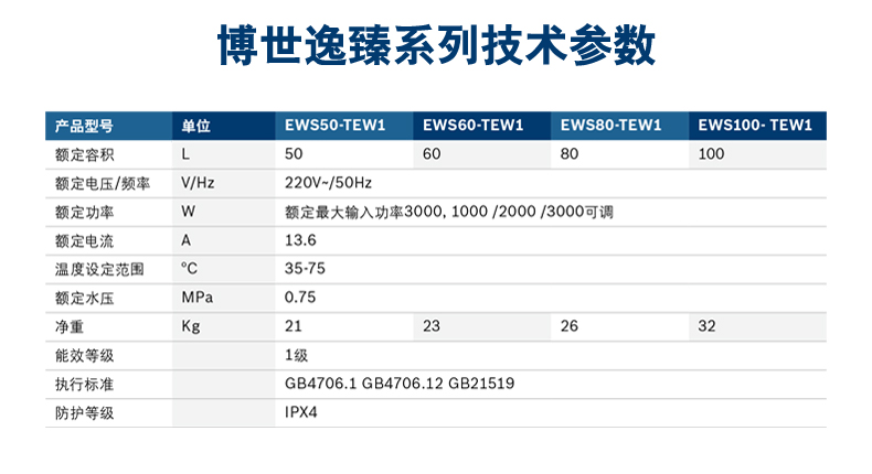 電子式控制,觸摸按鍵。無線遙控器。可選容積為50L/60L/80L/100L。