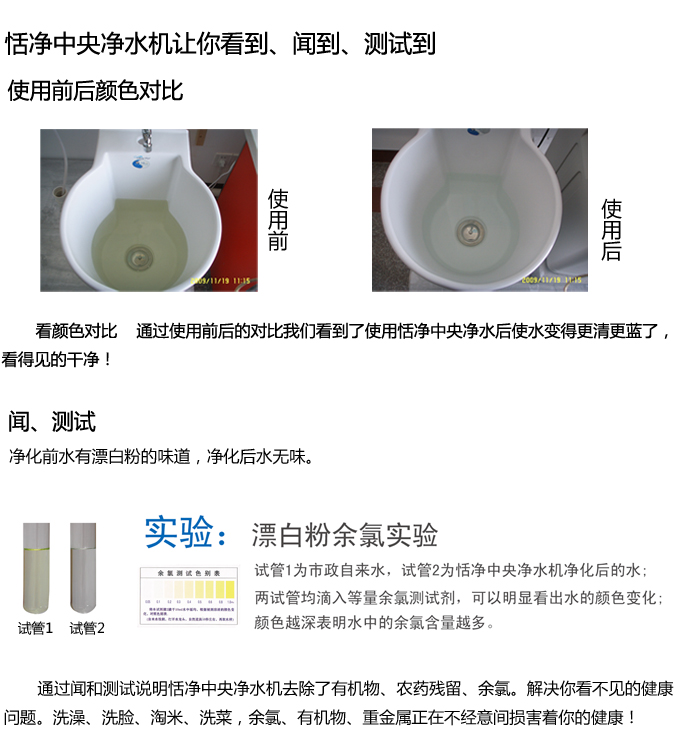 全自動中央凈水機有效去除水中的異色、異味;進一步濾除水中微小雜質、膠狀體;去除水中的漂白粉余氯、農藥、重金屬;保留對人體有益的礦物質。使水變得碧清、碧藍,去除對人體有害的物質。